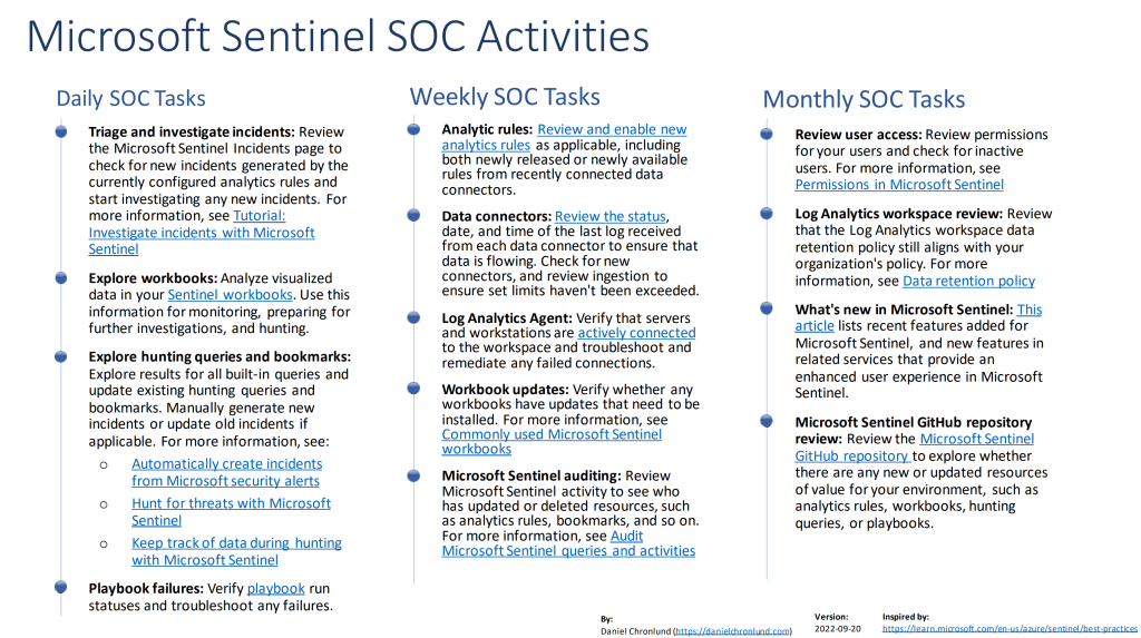 This is the Microsoft Sentinel SOC Activities cheat sheet and the purpose of it it to give you a simple overview of some of the daily, weekly, and monthly expected tasks the SOC will perform in Microsoft Sentinel.