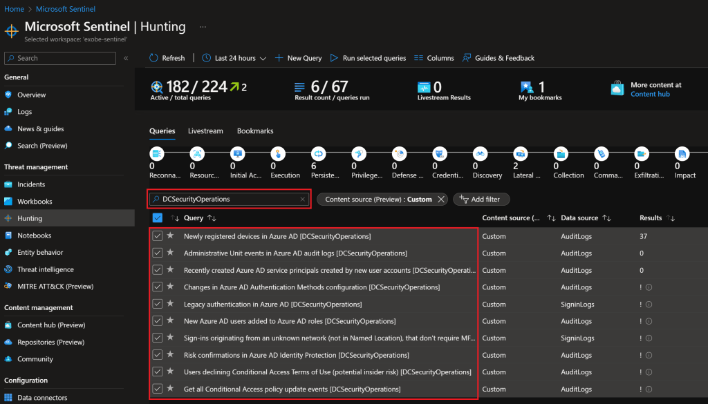 I’ve included a suffix on all hunting queries in DCSecurityOperations for easy filtering. Filter on DCSecurityOperations, mark all search results, and click Run selected queries. That’s it, check the results of each query where the Results column is greater than 0.
