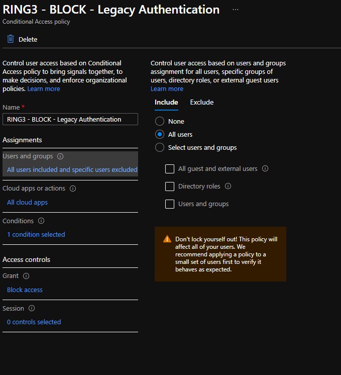 Make sure all your policys in your RING1 have the RING1 prefix in the name. All policies in RING1 includes our CAP RING1 group (see screenshot). This is an Azure AD group you must create and target all your RING1 policies against. Members of this group are the RING1 users. You also need to create a RING2 group with your pilot users.