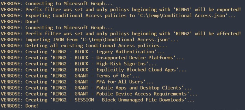 I recently read a great whitepaper by Claus Jespersen, called Microsoft Azure AD Conditional Access principles and guidance. I highly recommend you to check out his work! Claus, among many other things, talks about how you can ring manage Conditional Access policies and this got me thinking. My conditional access export/import tools have been included in DCToolbox for some time now and I thought to myself that it should be possible to use them as part of a ring deployment model. The only thing I actually needed to add was a prefix filter parameter so that it would be possible to distinguish different ring policy sets from each other through prefixes. I’ve included this change in version 1.0.22 and this article is a proof on concept of what you can do with it.