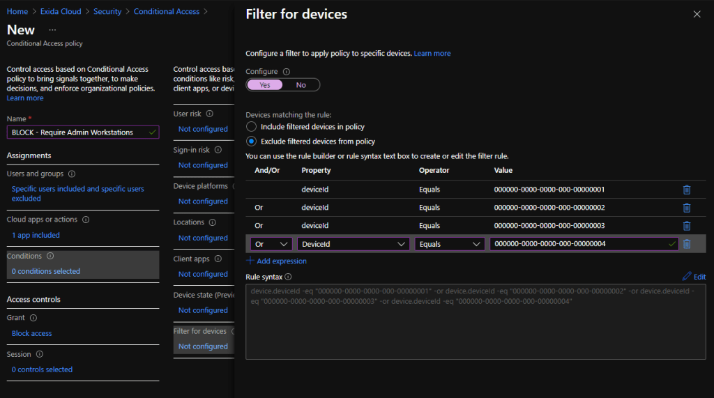 And this is where the magic happens. With the device filters condition, exclude all your admin workstations by checking for the Device ID (you find the Device ID GUID for each device in Azure AD). This means that the admin must sign in from a managed device with one of the specified device ID’s to access the Azure management tools.