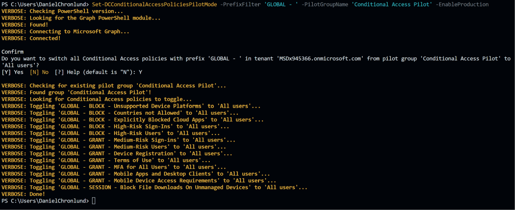 Set-DCConditionalAccessPoliciesPilotMode -PrefixFilter 'GLOBAL - ' -PilotGroupName 'Conditional Access Pilot' -EnableProduction